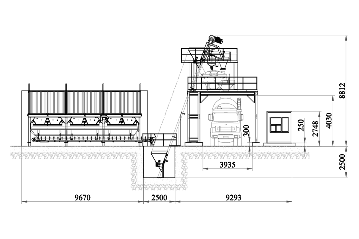 Загрузка инертных материалов в рядные бункера осуществляется с одного пандуса. Гибкость расположения бункеров: в линию, L-образно или Т-образно относительно скипа/конвейера.